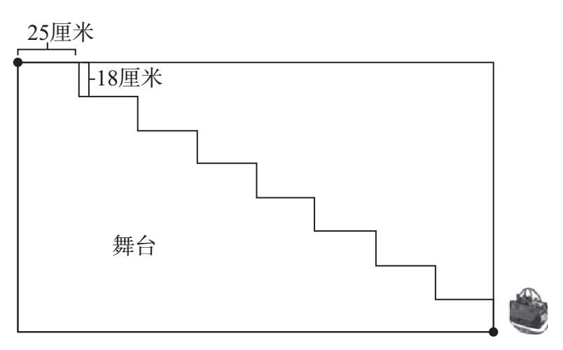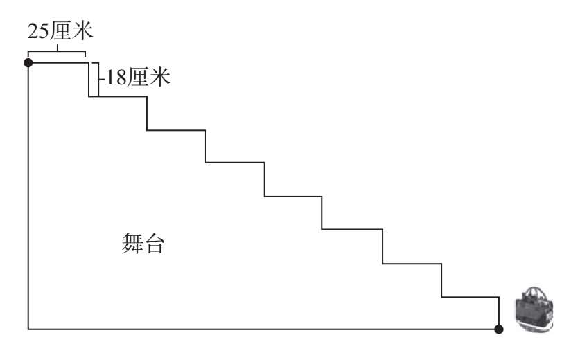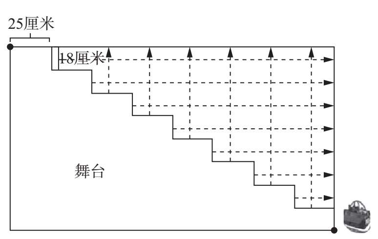 为庆祝“一带一路”国际合作高峰论坛在京顺利召开,某校决定举办一次文艺晚会。在搭设舞台之际,工作人员发现自己将工具包忘在舞台下,故而决定去拿。已知下舞台的楼梯共有8阶,每阶高度为18厘米,宽度为25厘米(具体如下图所示),请问工作人员经过的距离有多长?