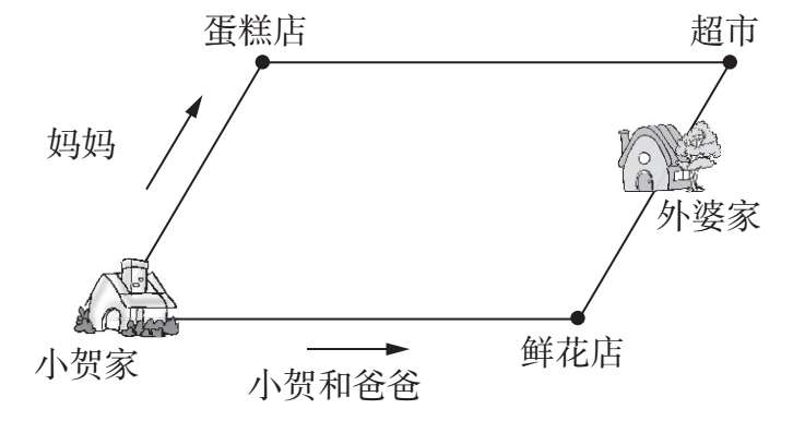 11.为了给外婆过生日,小贺一家分成两组出发。妈妈先后经过蛋糕店和超市,最后到达外婆家,同时小贺和爸爸也从家里出发,经过鲜花店,最后与妈妈同时到达外婆家。已知小贺和爸爸的行走速度是妈妈的