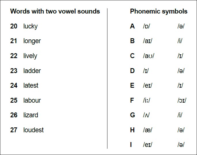 For questions 20 – 27 , each word has two vowel sounds. Match the words with the pairs of phonemic symbols listed A – I .