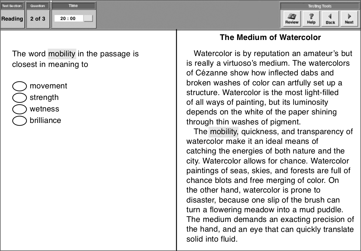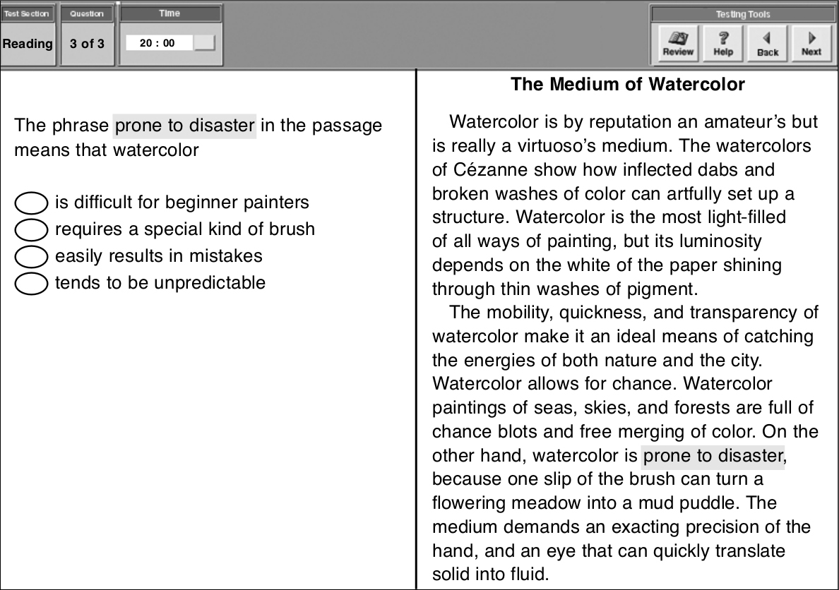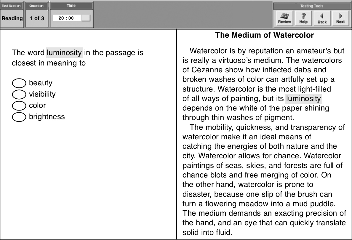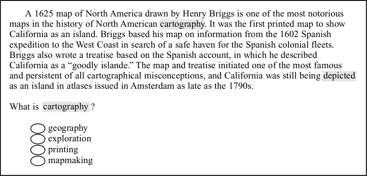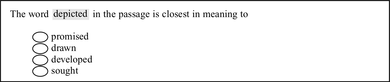 在托福考试中,根据上下文猜测词义的题目形式如下: