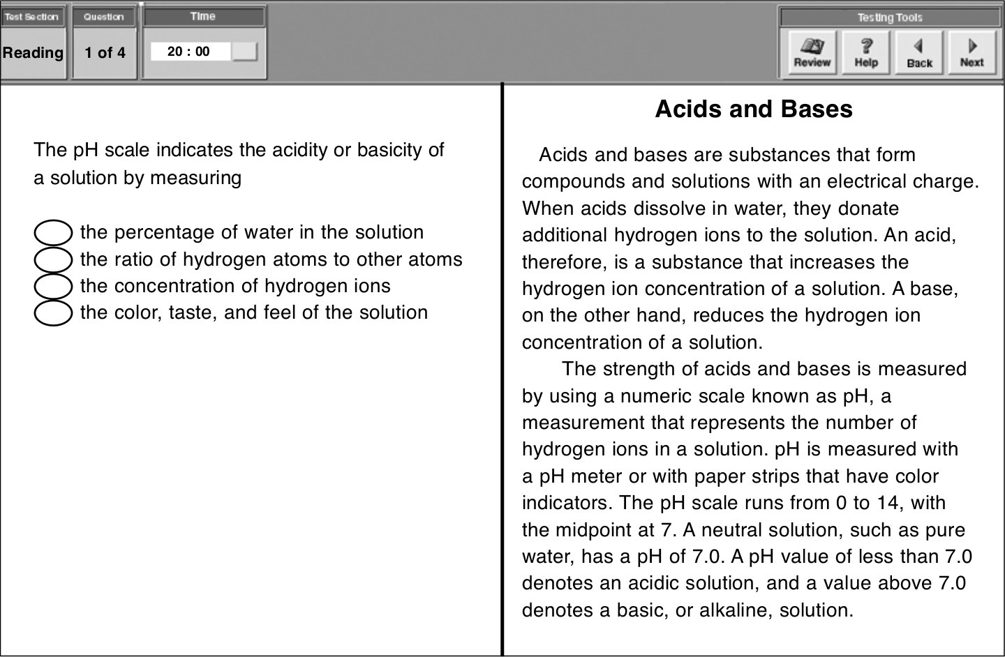 2 The strength of acids and bases is measured by using a numeric scale known as pH,a measurement that represents the number of hydrogen ions in a solution. pH is measured with a pH meter or with paper strips that have color indicators. The pH scale runs from 0 to 14, with the midpoint at 7. A neutral solution, such as pure water, has a pH of 7.0. A pH value of less than 7.0 denotes an acidic solution, and a value above 7.0 denotes a basic, or alkaline, solution. The pH of a solution declines as the concentration of hydrogen ions increases: the lower the number, the more acidic the solution. For example,a solution with a pH of 4.5 is far more acidic than one with a pH of 6.0. The pH for bases, or alkalis, is above 7.0: the higher the number, the greater the basicity or alkalinity.A pH of 8.5 is more alkaline than a pH of 7.5.