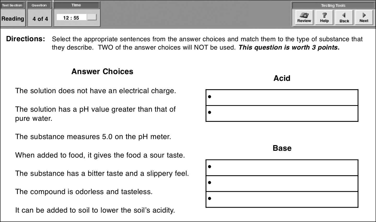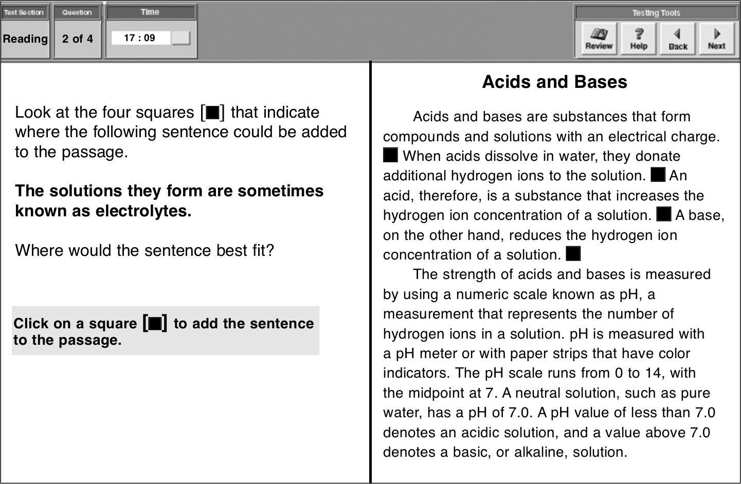 点击方块后,句子即会出现在方块所在的位置。需修改答案时,点击其他方块,句子即出现在新的位置。当考生准备好进行下一题时,点击Next。
