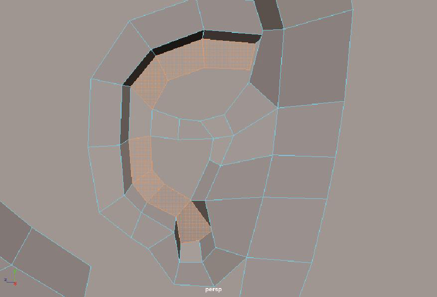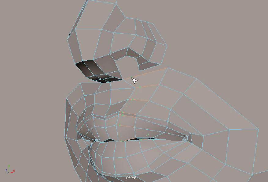 04 使用“挤出”工具挤出图4-169所示的边,调整顶点位置后,对该处的边线进行多次“挤出”操作,丰富耳朵的细节,如图4-170所示。