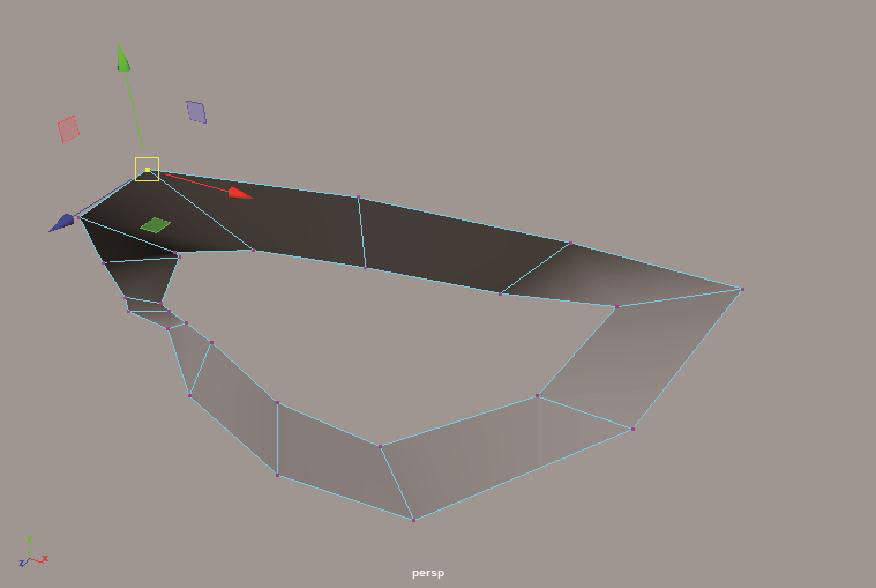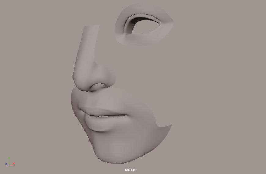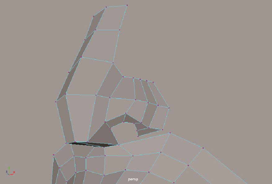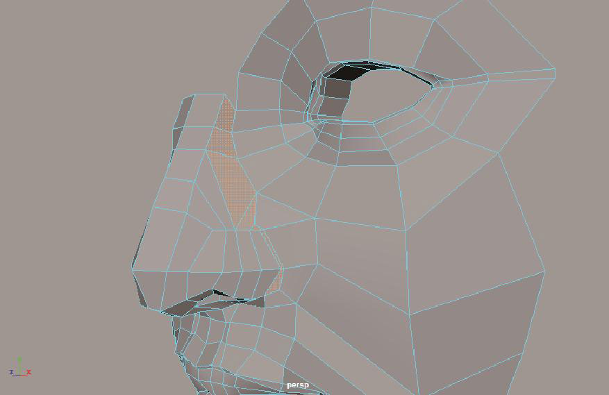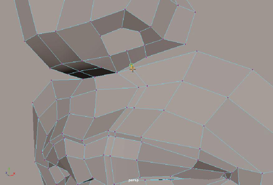 06 使用相似的方式桥接边,补上鼻子和眼眶之间的面,如图4-161所示,并调整模型的顶点位置至图4-162所示。07将鼻梁上方的面使用相似的方式进行补全,如图4-163所示。
