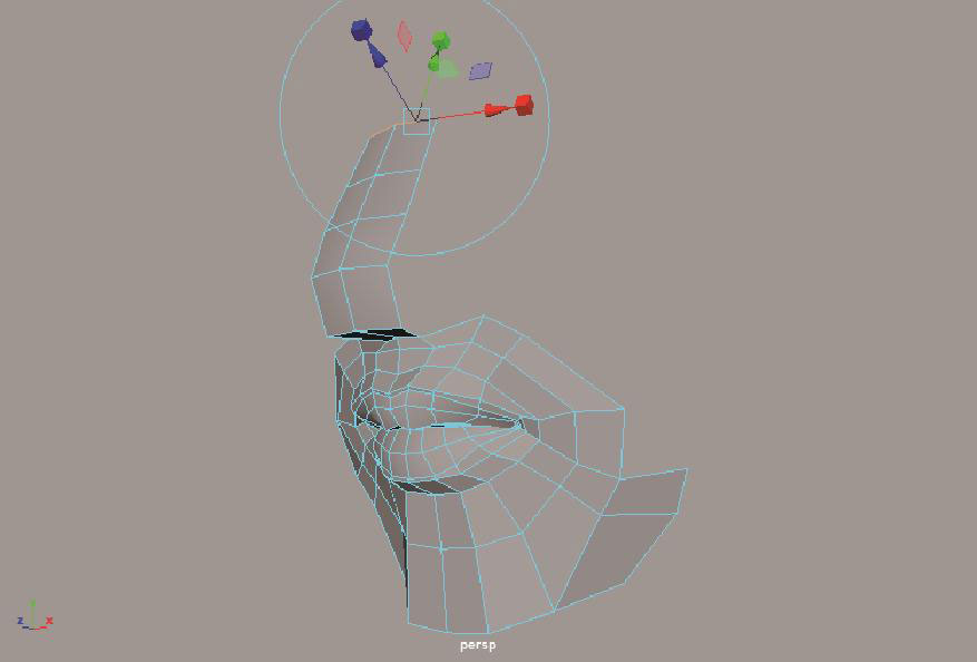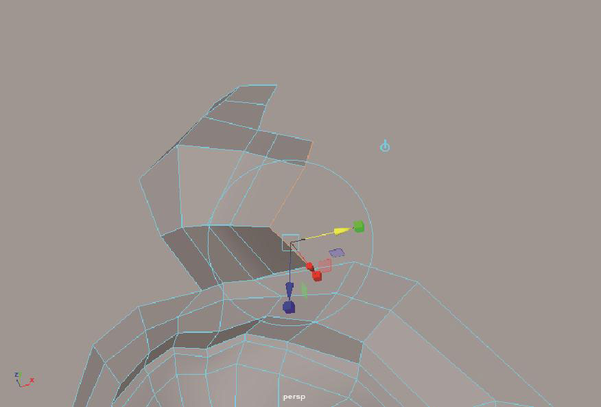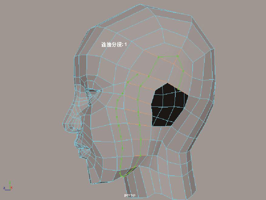 01 选择图4-187所示的边,对其进行多次“挤出”操作,并调整顶点的位置,完善头部形体,如图4-188所示。