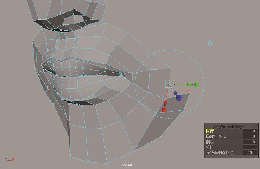 06 选择图4-109所示的边,对其进行“挤出”操作,并进入“顶点选择”组件,调整模型的顶点位置至图4-110所示,制作出嘴唇的厚度。