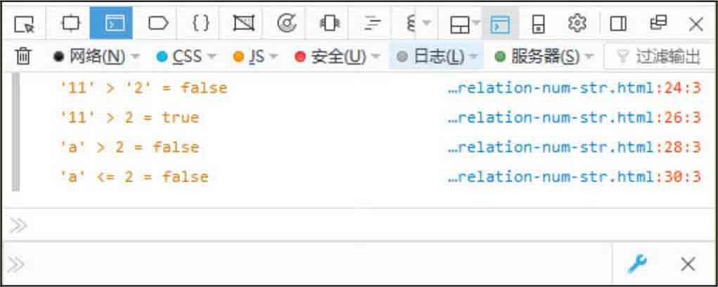 而第08行代码尝试对数值型字符串“a”和数值2进行比较运算("a" <= 2);从第09行代码输出的结果可以看到,关系运算符表达式("a" <= 2)的返回值为false,这同样是因为字符串“a”不能合理转换成数值,返回值为NaN。