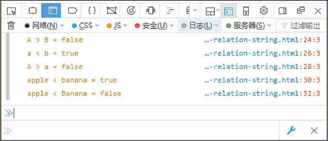 下面,来看一个字符串关系运算符表达式的代码示例(详见源代码ch03目录中ch03-js-operator-relation-string.html文件)。