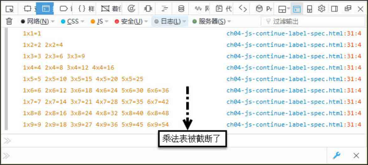 如果将【代码4-14】中的break语句改写成continue语句呢?下面,我们再看一个continue语句与标签语句配合的代码示例(详见源代码ch04目录中ch04-js-continue-label-spec.html文件)。