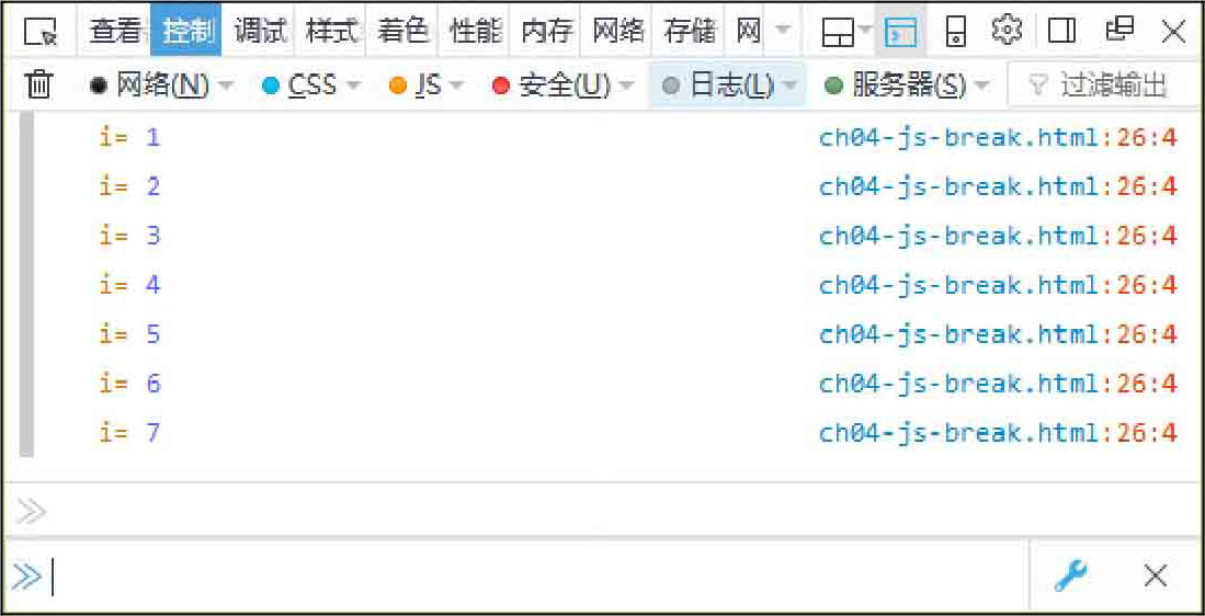 下面来看一个使用break语句终止循环体的代码示例(详见源代码ch04目录中ch04-js-break.html文件)。