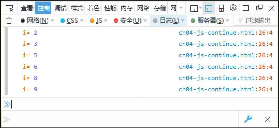 下面来看一个使用continue语句终止循环体的代码示例(详见源代码ch04目录中ch04-js-continue.html文件)。