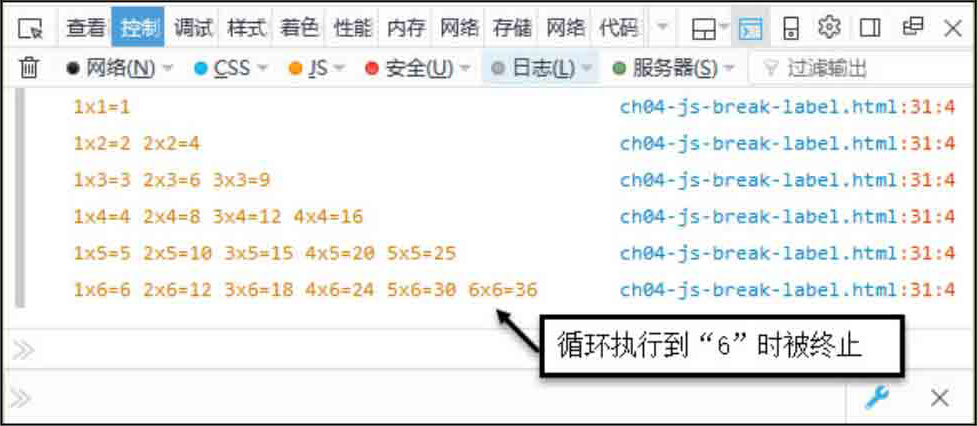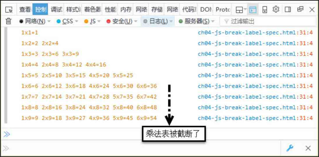 下面,先看一个break语句与标签语句配合使用的代码示例(详见源代码ch04目录中ch04-js-break-label.html文件)。
