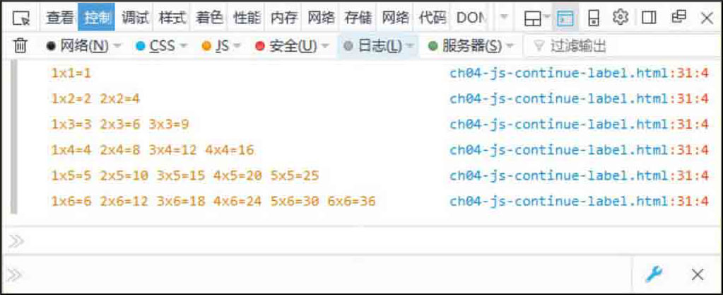 下面,先看一个continue语句与标签语句配合使用的代码示例(详见源代码ch04目录中ch04-js-continue-label.html文件)。