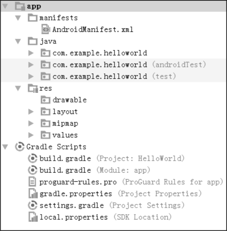 (2)java子目录,下面有3个com.example.hellorworld包,其中第一个包存放的是App工程的java源代码,后面两个包存放的是测试用的Java代码。