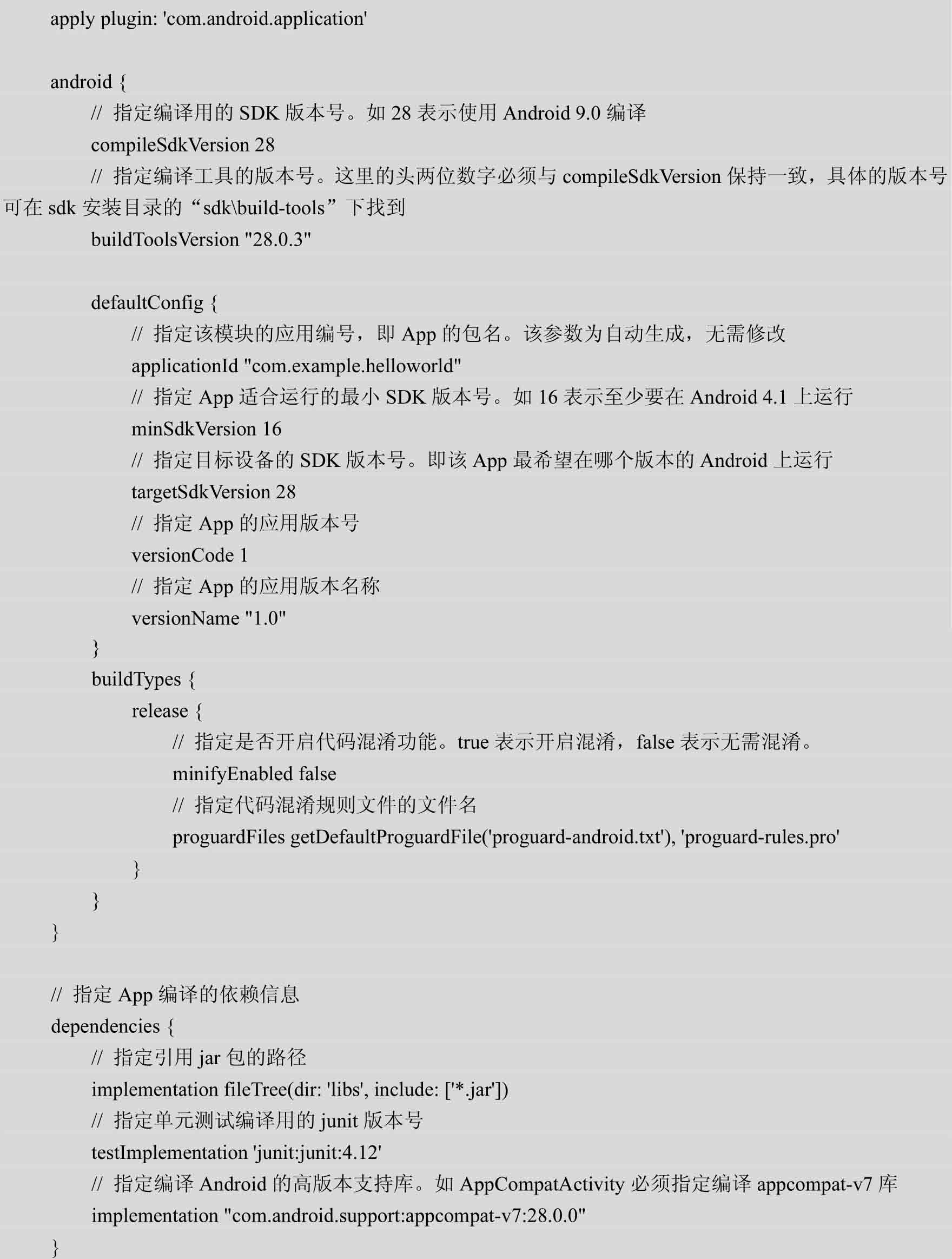 项目级别的build.gradle一般无须改动,读者只需关注模块级别的build.gradle。下面在初始的build.gradle文件中补充文字注释,方便读者更好地理解每个参数的用途。