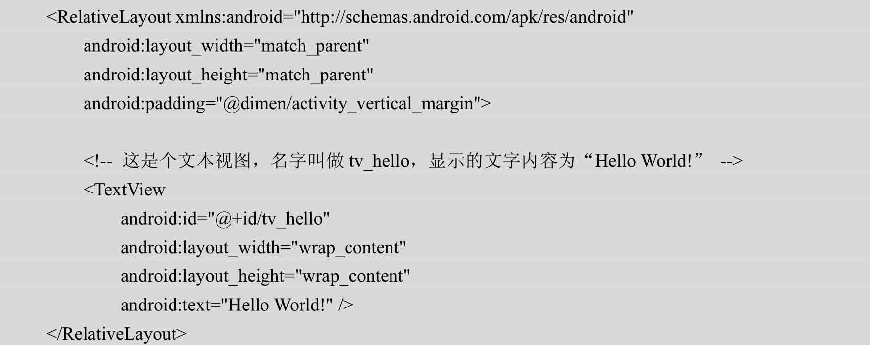 在一开始创建Hello World工程时,Android Studio默认打开了两个文件,分别是布局文件activity_main.xml和代码文件MainActivity.java。下面先看布局文件activity_main.xml的内容: