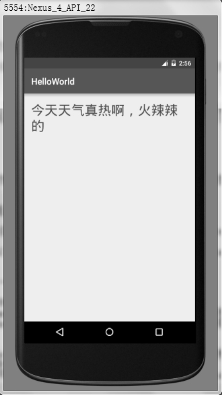 这里可以看到xml文件中只有两个节点,分别是RelativeLayout和TextView。再仔细看看,有没有发现熟悉的“Hello World”?没错,模拟器App界面显示的Hello World就来自于这里,也就是TextView控件的android:text属性值。可以把这里的Hello World改为其他文字,比如“你好、世界”或I Love Android,改完保存文件后再依次选择菜单Run→Run 'app',看看App界面上的文字是不是变成新的了?