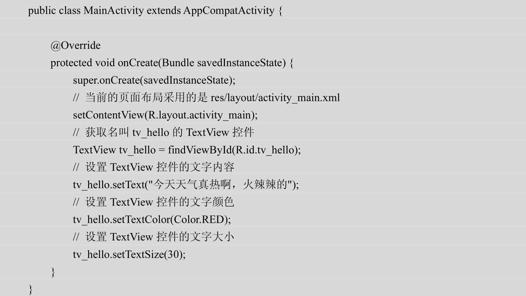 这里可以看出,MainActivity.java的代码内容很简单,只有一个MainActivity类,该类下面只有一个函数onCreate。注意onCreate内部的setContentView方法直接引用了布局文件的名字activity_main,该方法的意思是往App界面填充activity_main.xml的布局内容。现在我们要在这里改动改动,加点“绿叶红花”让它好看一些。首先打开activity_main.xml,在TextView节点下方补充一行android:id="@+id/tv_hello";然后回到MainActivity.java,在setContentView方法下面补充几行代码,具体如下: