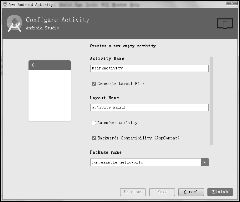 此时会弹出新页面的创建对话框如图1-36所示,其中Activity Name一栏填写页面的Java类名,Layout Name一栏填写页面的XML布局名称,Package Name保持默认的包名,确认无误后单击窗口右下方的Finish按钮。