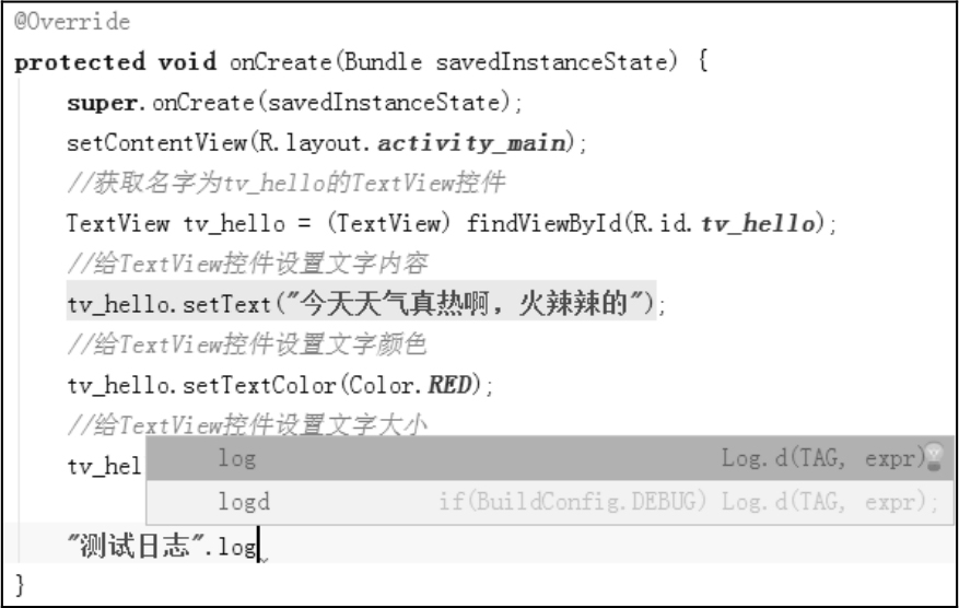该插件支持在代码中快速生成Toast、Log等代码行。开发者在代码中输入字符串,后面跟上.toast并回车,即可生成Toast.makeText代码行;输入字符串后,紧接着输入.log并回车,即可生成Log.d代码行,如图1-33所示。