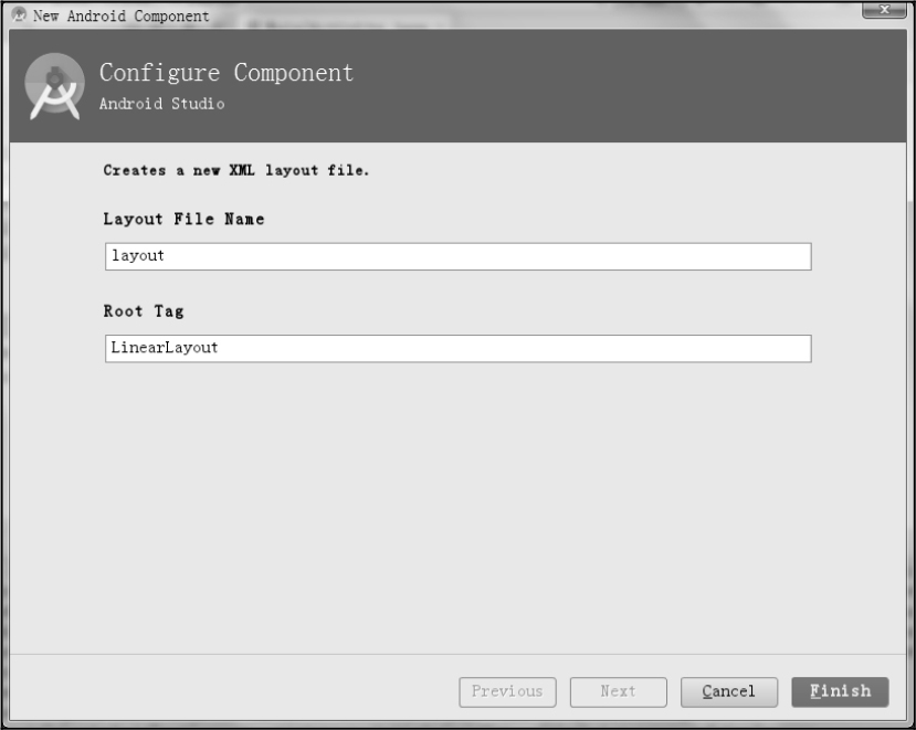 倘若是创建单个XML布局文件,则需右击layout目录,在右键菜单中依次选择New→XML→Layout XML File,此时弹出XML的创建对话框如图1-39所示。在该窗口的Layout File Name一栏填写布局文件的名称,在Root Tag一栏填写XML的根节点名称,最后单击窗口右下方的Finish按钮,即可完成XML布局文件的创建操作。
