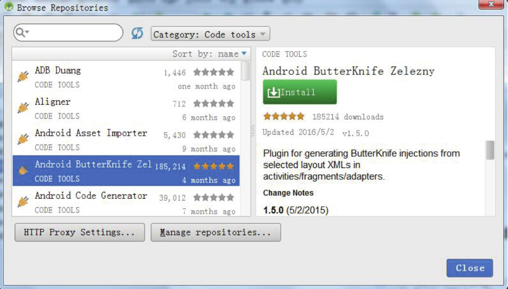 在安装插件窗口的Category框中选择Code tools,然后选中左边列表的指定插件,再单击右边窗口内部的Install按钮,安装后重启Studio即可正常使用该插件的功能。下面是5个常用的Studio插件:
