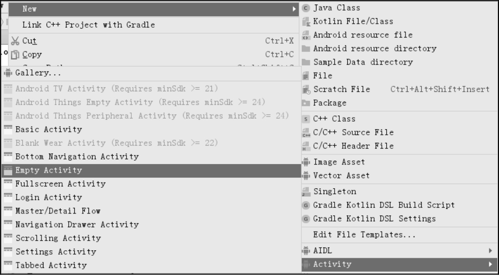 在左侧工程结构图中,选定新页面所在的包名如com.example.helloworld,然后右击该包名,并在弹出的右键菜单中依次选择New→Activity→Empty Activity,右键菜单如图1-35所示。