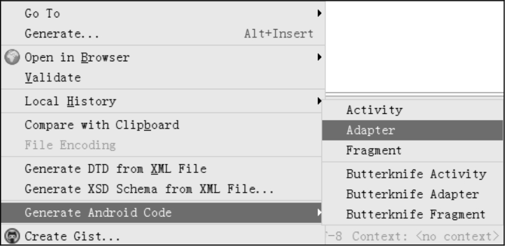该插件可根据布局文件快速生成对应的Activity、Fragment、Adapter、Menu等代码。在布局文件上右击或者在布局文件内部右击,弹出的菜单中多了一个Generate Android Code选项,具体的菜单如图1-31所示。选中生成项后,便会弹出代码窗口,把已生成的代码复制出来即可。注意该插件对汉字的支持不太好,如果XML文件中有汉字,代码就会生成失败。