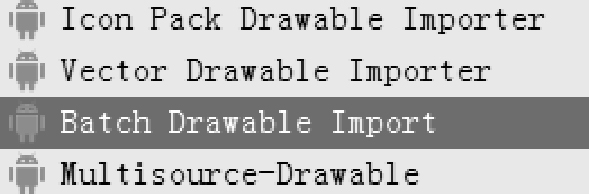 该插件可对一张图片自动生成不同分辨率的图片,从而让图片对不同屏幕的适配工作变得更加容易。右击任意目录,在弹出的菜单中选择New,右方弹出的菜单列表末尾会出现*** Drawable Importer之类的菜单项,如图1-34所示。