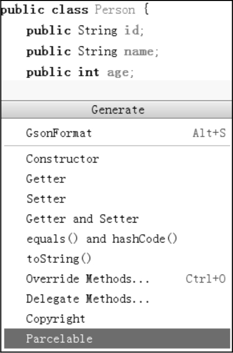 该插件可自动生成Parcelable接口的代码。开发者先写好一个类和内部变量的定义,然后在代码中按Alt+Insert,弹出的菜单列表下方就有Parcelable选项,如图1-30所示。选中该选项,即在类中插入实现Parcelable接口的代码。