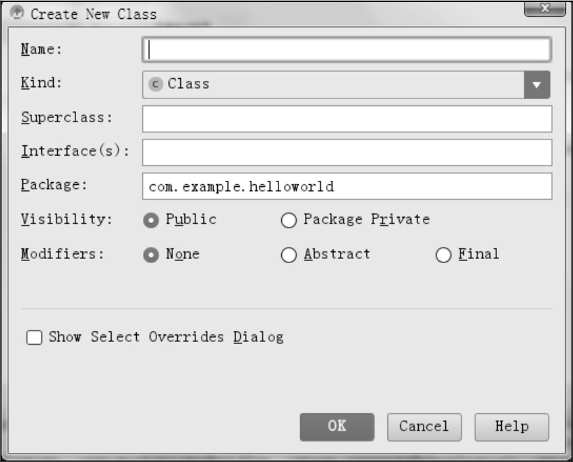 上述操作步骤虽然一次性生成了Java代码及其对应的XML布局,可是实际开发中往往还需要单独生成Java代码,或者单独生成XML文件。创建单个文件的操作那更简单了,倘若是创建单个Java代码文件,则需右击工程目录的包名,在右键菜单中依次选择New→Java Class,此时弹出新类的创建对话框如图1-38所示。在该窗口的Name一栏填写Java的类名,在Superclass一栏填写父类的名称(如果有的话),最后单击窗口下方的OK按钮,即可完成Java代码的创建操作。