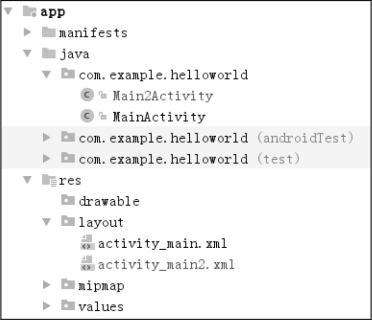 接着Android Studio会自动在默认包名下面生成页面代码Main2Activity.java,在res\layout下面生成页面布局activity_main2.xml,新页面创建之后的工程结构如图1-37所示。