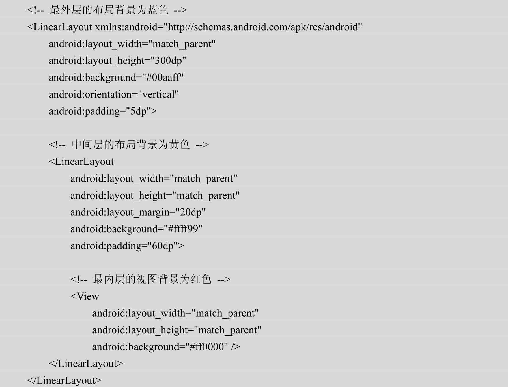 前面提到margin和padding两个概念,margin是指当前视图与周围视图的距离,padding是指当前视图与内部内容的距离。这么说可能有些抽象,所谓百闻不如一见,说得再多不如亲眼看看是怎么回事。接下来做一个实验,看看它们的显示效果有什么不同。下面是实验用的布局文件源代码,以背景色观察每个控件的区域范围: