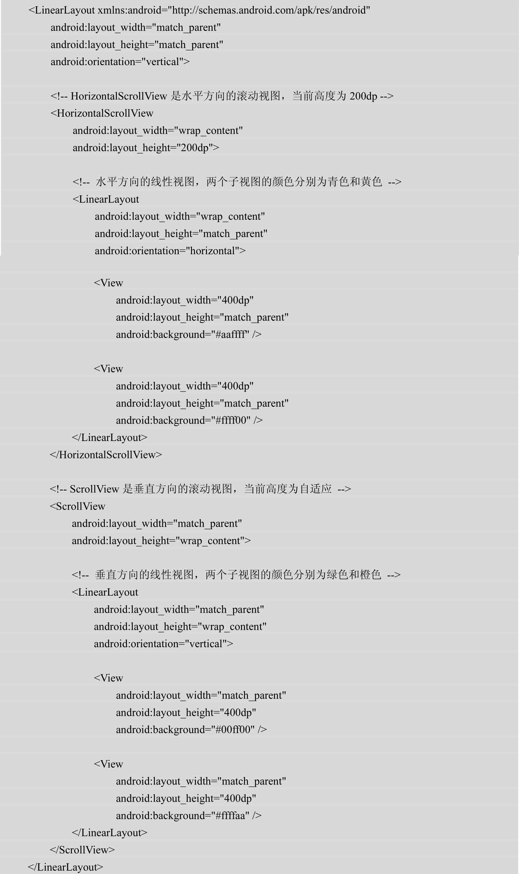 下面是滚动视图ScrollView和水平滚动视图HorizontalScrollView的XML用法示例: