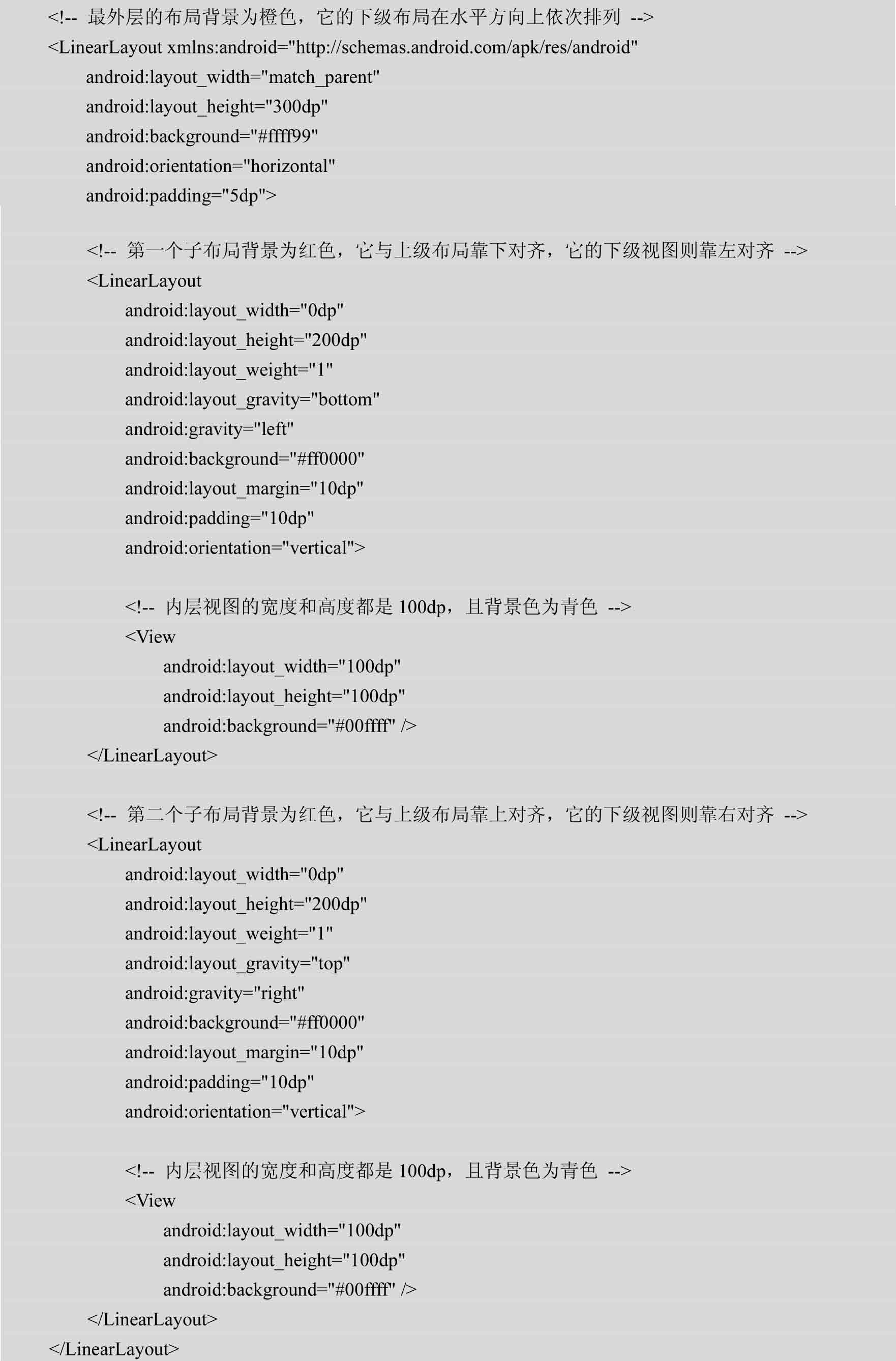 接下来重点解释layout_gravity和gravity的区别。前面说过,layout_gravity指定该视图与上级视图的对齐方式,而gravity指定布局内部视图与本布局的对齐方式。为方便理解,下面通过一个具体例子演示两种属性的显示效果。下面是演示用的XML布局文件,内部指定了多种对齐方式,其中左边视图的layout_gravity是bottom、gravity是left;右边视图的layout_gravity是top、gravity是right,布局文件内容如下: