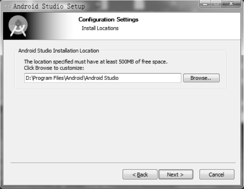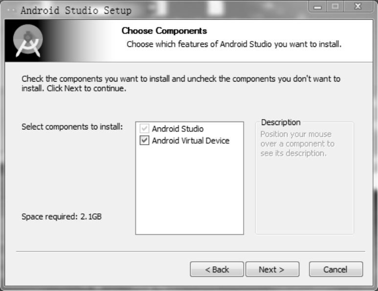 双击下载完成的Android Studio安装程序,弹出安装界面,如图1-1所示。全部勾选安装界面中的选项,然后单击Next按钮。进入下一页的安装路径配置页面,如图1-2所示,建议将Android Studio装在除系统盘外的其他磁盘(比如D盘),然后单击Next按钮。