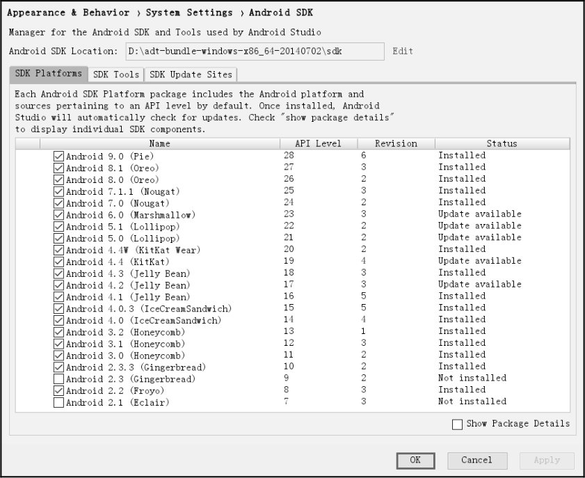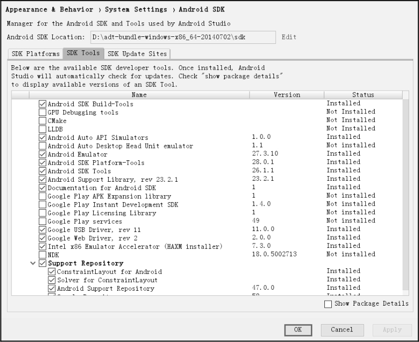 此时弹出Android SDK的管理界面,窗口右边是一大片的SDK配置信息,初始画面如图1-7所示。其中Android SDK Location一栏可单击右侧的Edit链接,进而选择SDK下载后的保存路径。其下的三个选项卡默认显示SDK Platforms,也就是各个SDK平台的版本列表,勾选每个列表项左边的复选框,则表示需要下载该版本的SDK平台,然后单击OK按钮即可自动进行SDK的下载安装操作。也可单击中间的选项卡SDK Tools,单击后切换到SDK工具的管理列表,如图1-8所示。在这个工具管理界面,能够在线升级编译工具Build Tools、平台工具Platform Tools,以及开发者需要的其他工具。