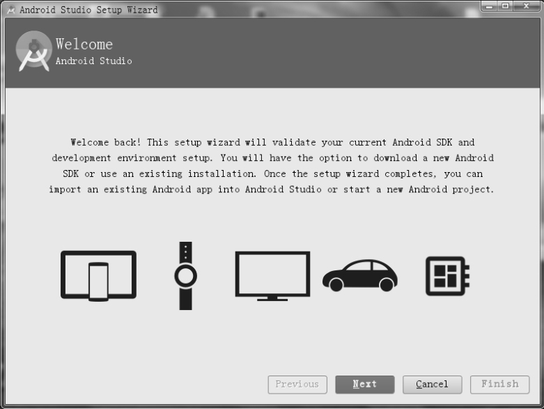 安装完毕会跳到Android Studio的安装向导界面,如图1-3所示。单击Next按钮进入下一页,如图1-4所示。这里保持Standard选项,单击Next按钮;在配置界面确认SDK的安装路径是否正确,确认完毕继续单击Next按钮;在最后一个向导界面单击Finish按钮,等待设置操作。接下来的下载界面会自动跳转到谷歌网站更新组件,这里直接单击Cancel按钮取消下载,然后单击Finish按钮结束设置。最后弹出Welcome to Android Studio欢迎界面,如图1-5所示。单击第一项的Start a new Android Studio project即可开始你的Android开发之旅。