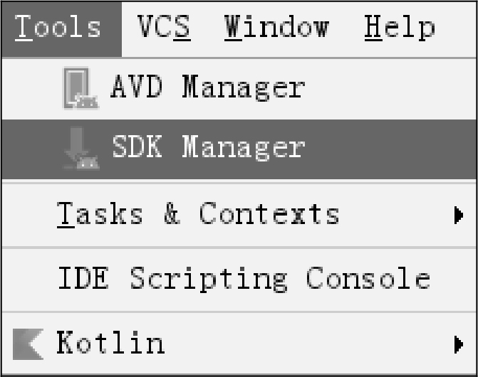 在Android Studio主界面,依次选择菜单Tools→SDK Manager,菜单路径如图1-6所示。