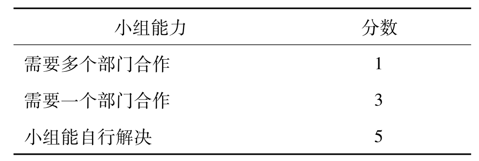 (2)计算小组改善能力。改善能力预计法的另一个重要组成部分则是小组能力。小组能力可以采用小组成员组内评分的方式评定,评分为1~5分(可参照表2-3),取最终评分的平均值。小组能力数值一般最终转化为百分比,如小组平均评分为3.5分时,则得3.5/5×100%=70%。