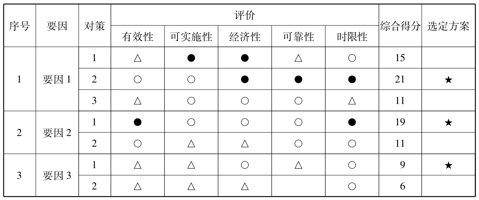 从针对每一条主要原因所提出的若干个对策中分析研究,究竟选择什么样的对策和解决到什么程度,可以从有效性、可实施性、经济性、可靠性和时限性等方面进行确定。