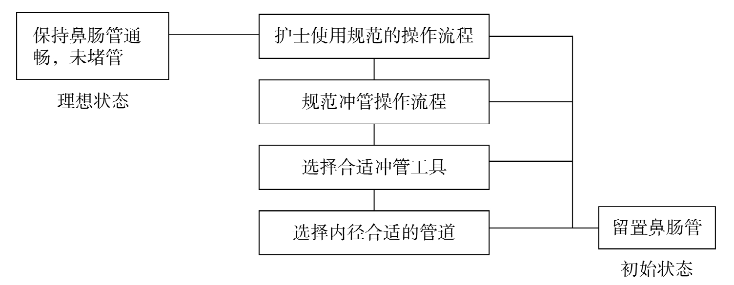 图2-8表示:预防患者的鼻肠管发生堵管,按照管道留置和维护的过程制定对策预防堵管。首先给患者留置的鼻肠管的选择,需要选择内径合适的鼻肠管,如果选择内径细的管道易造成堵管;管道置好后要进行维护,需要选择合适的维护工具,例如冲管工具选择注射器还是甘油节,选择哪种规格型号,这些都会影响冲管的效果;冲管工具选好后,就是采用何种维护流程,即冲管的方式和频率的选择;最后是由谁来操作的问题,操作者是否知晓这些操作流程。从置管到维护的过程中,任何一个环节选择不当都会造成堵管。这种顺向思维的方法就是按照正常的操作顺序考虑问题,制定避免发生不良后果所需要采取的对策。
