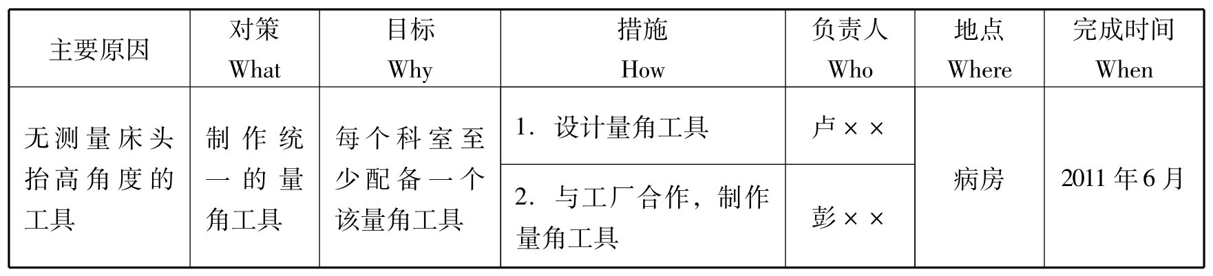 对策表中制定的目标应尽可能量化,如果确实不能量化,要做到可以检查。比如,“提高实施肠内营养的患者床头抬高措施落实率”的专案,其中提到的主要原因之一为没有测量床头抬高的量角工具,对策为制作统一的量角工具,目标是每个科室至少配备一个该量角工具,措施应是由谁来制作,制作什么样的工具,以确保能够利用量角工具正确测量床头抬高的角度。