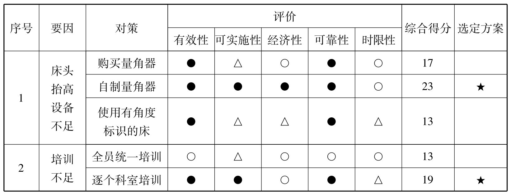 首先针对每一条主要原因,护理专案改善活动小组成员利用头脑风暴法,提出解决问题的可能对策。每条原因都可提出若干个对策,先不必考虑提出的对策是否可行,只要是想得到的对策就可以提出来,最后探讨所有可能的方案及解决对策。比如,在分析“提高实施肠内营养的患者床头抬高措施落实率”的专案改善中“床头抬高设备不足”这一主要原因时,我们要从是在原有床单位的基础上改进,使其可以固定抬高角度,还是制作合适的量角工具测量床头抬高角度,或者直接更换成具有测量床头抬高角度功能的新床等方面进行考虑,对策提得越多、越具体则越好。在提出对策的过程中,可通过文献查证、依照工作经验或研究结果寻找可供参考的做法。