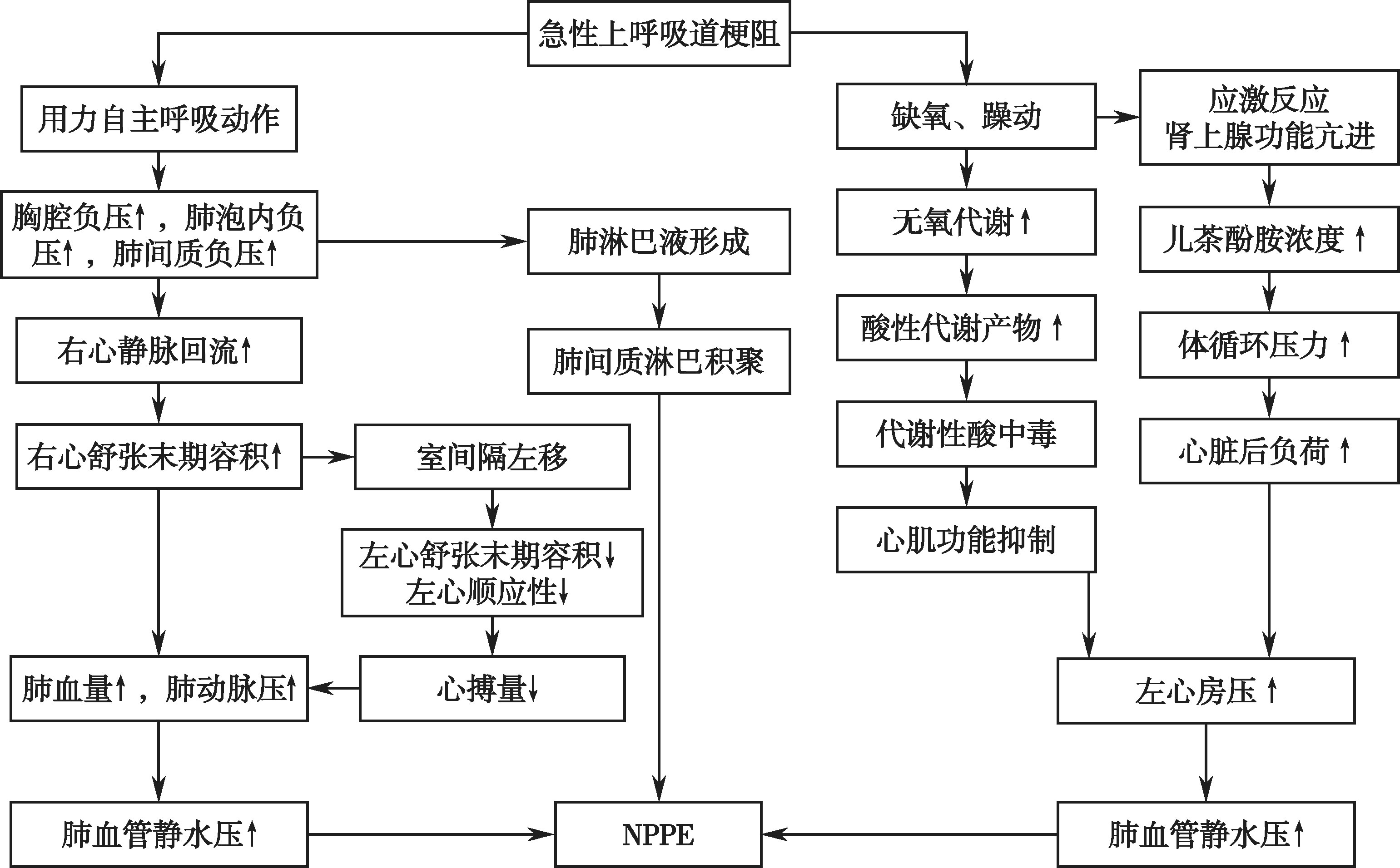 NPPE患者用力吸气使胸腔内负压增大,导致静脉回流增加,引起右心舒张末期容积、肺循环血流量及肺血管内压力增加。同时右心室舒张末期容积增加,通过室间隔左移使左室顺应性、左室舒张期末容积及心搏出量下降,左心房压力升高,肺血管内压力上升,使肺毛细血管内液渗出进入肺泡和肺间质。