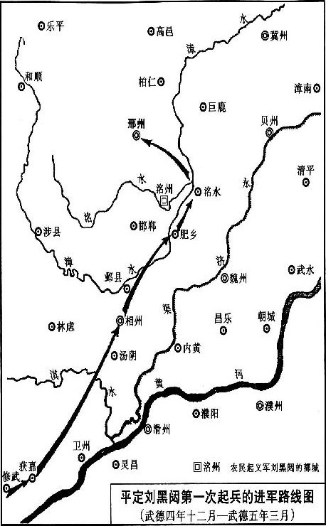 次日,李世民整军北上,其时天寒地冻,道路一时难行。李世民下令,兵贵神速,全军顶风冒雪而行,行进甚疾。这日大军行到肥乡,刘黑闼布下的守城之军不堪一击,很快被迫出降。肥乡一失,周围的刘军闻讯大惧,纷纷来降。数日间,豫章守将张善安携虔、吉等五州来降,阳孝成、冯伯让等人也举城来归,这日,刘黑闼的洺水城守将李去惑派人来见李世民,言说欲献洺水城出降。