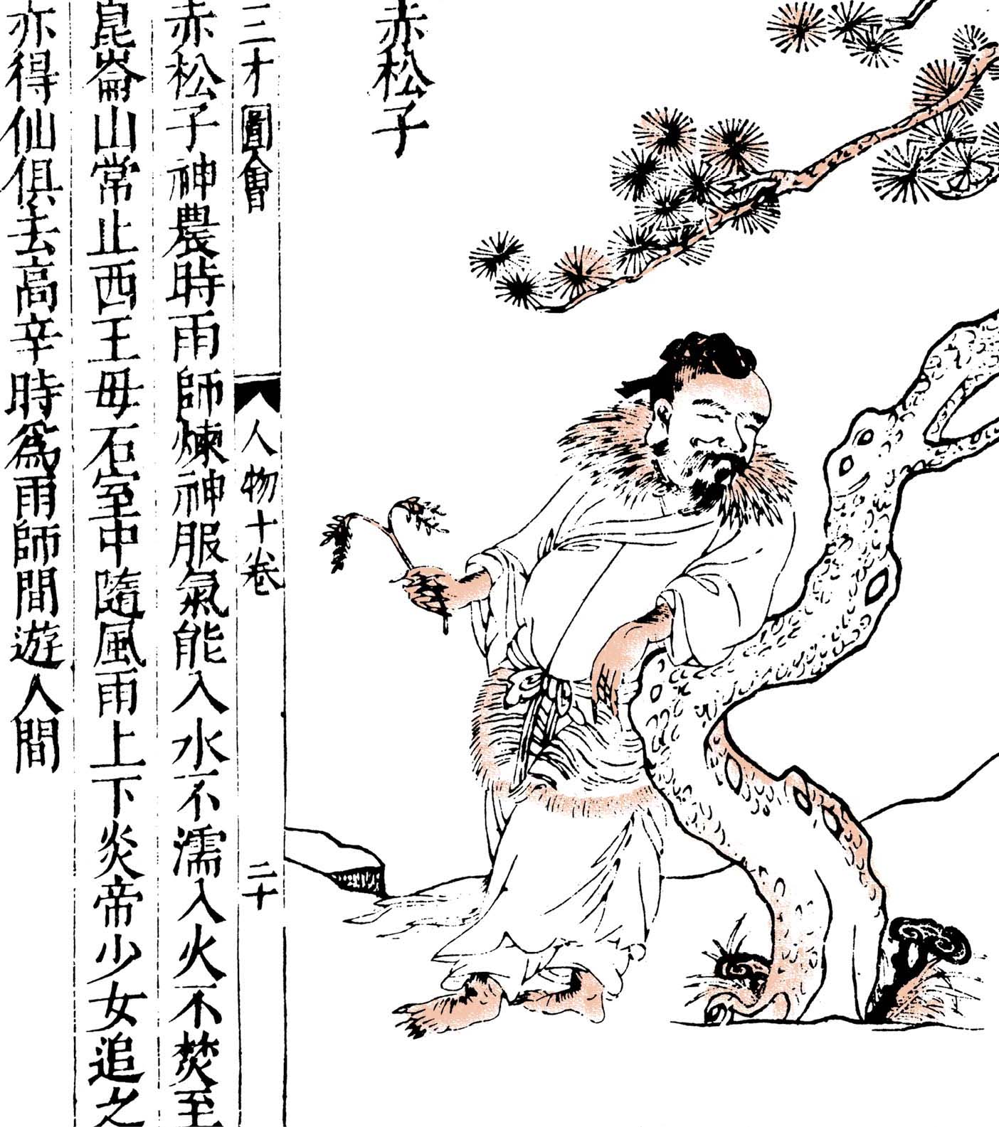 《列仙传》:“赤松子者,神农时雨师也,服水玉以教神农,能入火自烧。往往至昆仑山上,常止西王母石室中,随风雨上下。炎帝少女追之,亦得仙,俱去。至高辛时,复为雨师,今之雨师本是焉。眇眇赤松,飘飘少女。接手翻飞,泠然双举。纵身长风,俄翼玄圃。妙达巽坎,作范司雨。”