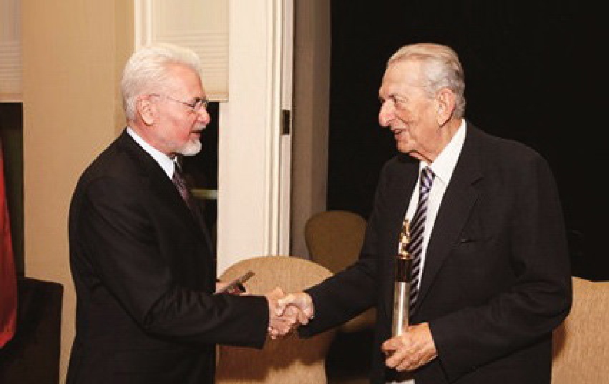 奥拉赫出身于匈牙利布达佩斯的一个艺术世家,2011年,匈牙利为他在化学工程学方面的成就颁发了匈牙利科学院最高奖, 图3 为匈牙利科学院院长约瑟夫·帕尔卡斯为他颁奖,图中右者是奥拉赫。虽然早年奥拉赫离开了匈牙利,匈牙利祖国仍把他称为“匈牙利之子”。