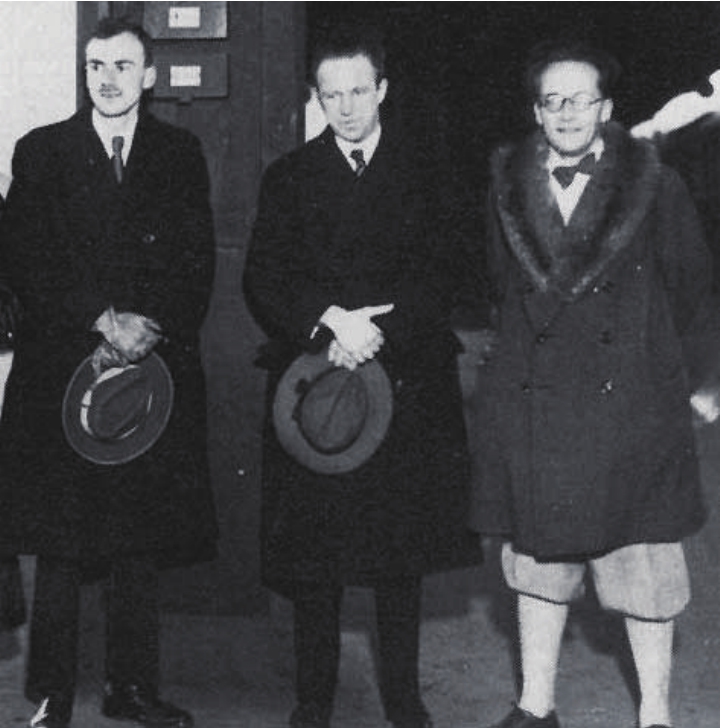 1932年,狄拉克接替拉莫尔成为剑桥大学第15届卢卡斯数学教授。这是剑桥历史上最高科学荣誉称号之一,另一个是卡文迪许教授职位。获此殊荣时,狄拉克还不到30岁,比1669年牛顿接受此职位时仅大几个月。听到了这个消息后,狄拉克立刻离开了剑桥,以避开震耳欲聋的祝贺声。紧接着,更大的荣誉接踵而至。就在第二年,狄拉克与薛定谔一起分享当年的诺贝尔物理学奖。最初,他想拒绝这个奖,但他的老师福勒劝他,如果拒绝,将招致更多公众的注意。 图2 左起为狄拉克、海森堡和薛定谔,这幅照片是赴斯德哥尔摩领取诺贝尔奖时拍摄的。