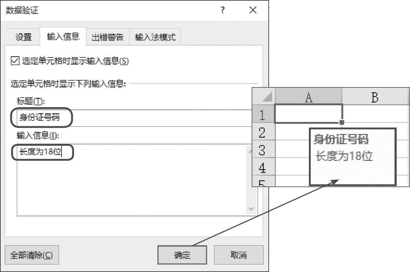 在“数据验证”对话框中,“输入信息”选项卡的作用是“温馨提醒”,提示输入数据的相关信息。用户可以勾选“选定单元格时显示输入信息”复选框,在“标题”和“输入信息”文本框中可以输入具体需要显示的内容。比如,当为A1单元格设置数据验证时,如果在“标题”和“输入信息”文本框中分别输入“身份证号码”和“长度为18位”,设置数据验证后,在A1单元格旁边就会出现预设的提示信息,如图2-3所示。